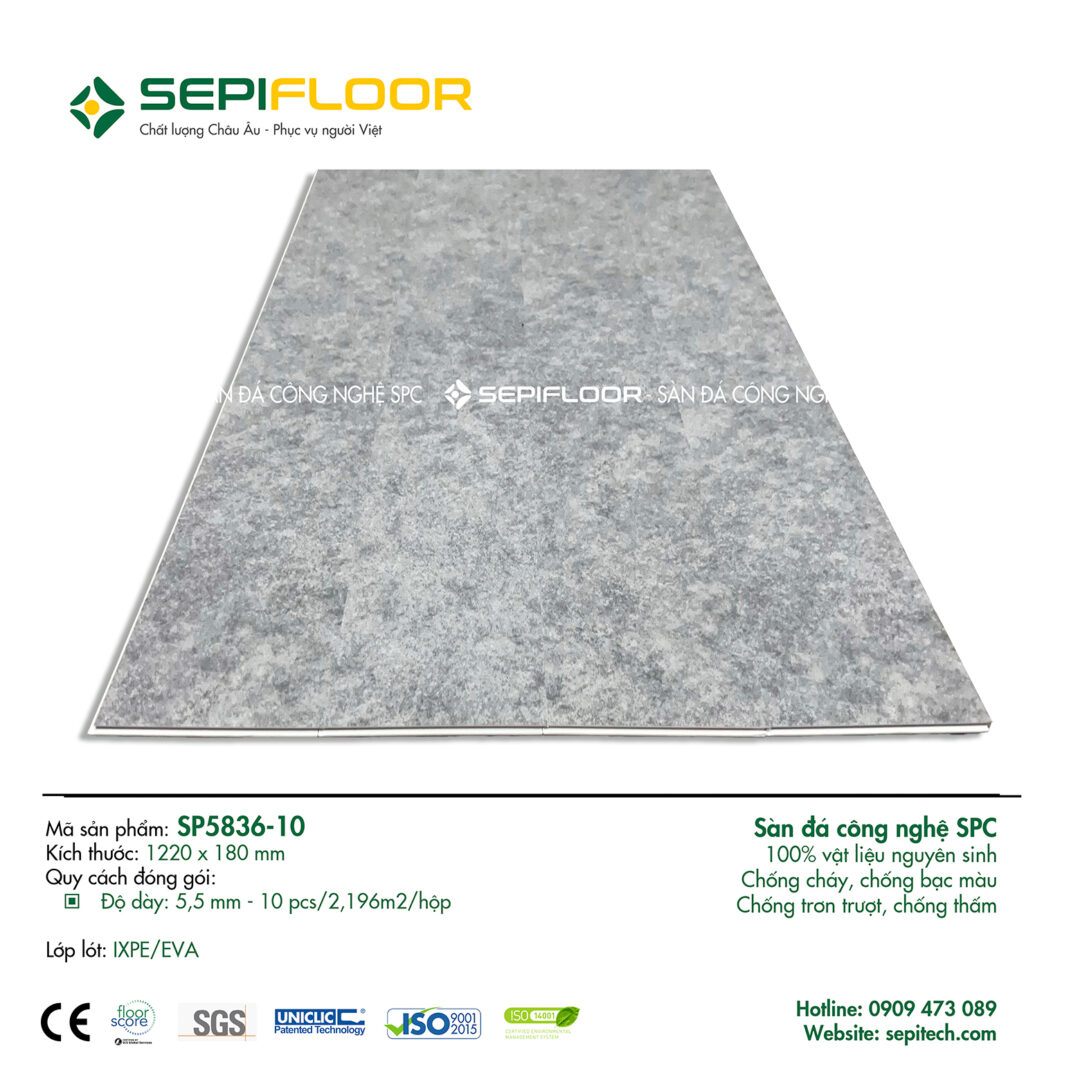 Sàn SPC là sàn đá công nghệ hay còn được biết đến với tên khác là sàn nhựa. Sàn đá SPC SEPIFLOOR được cấu tạo bởi bột nhựa PVC nguyên sinh kết hợp cùng bột đá canxi carbonate tự nhiên, với tỉ lệ PVC:Ca là 1:3 vì vậy sàn vẫn có màu nguyên bản của vật liệu là màu trắng.